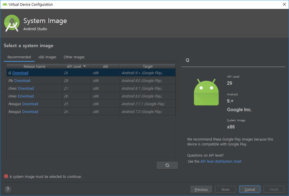 처음 실행하면 System Image, 즉 안드로이드 OS를 실행할 파일이 없는데 원하는 버전을 Download 받자.