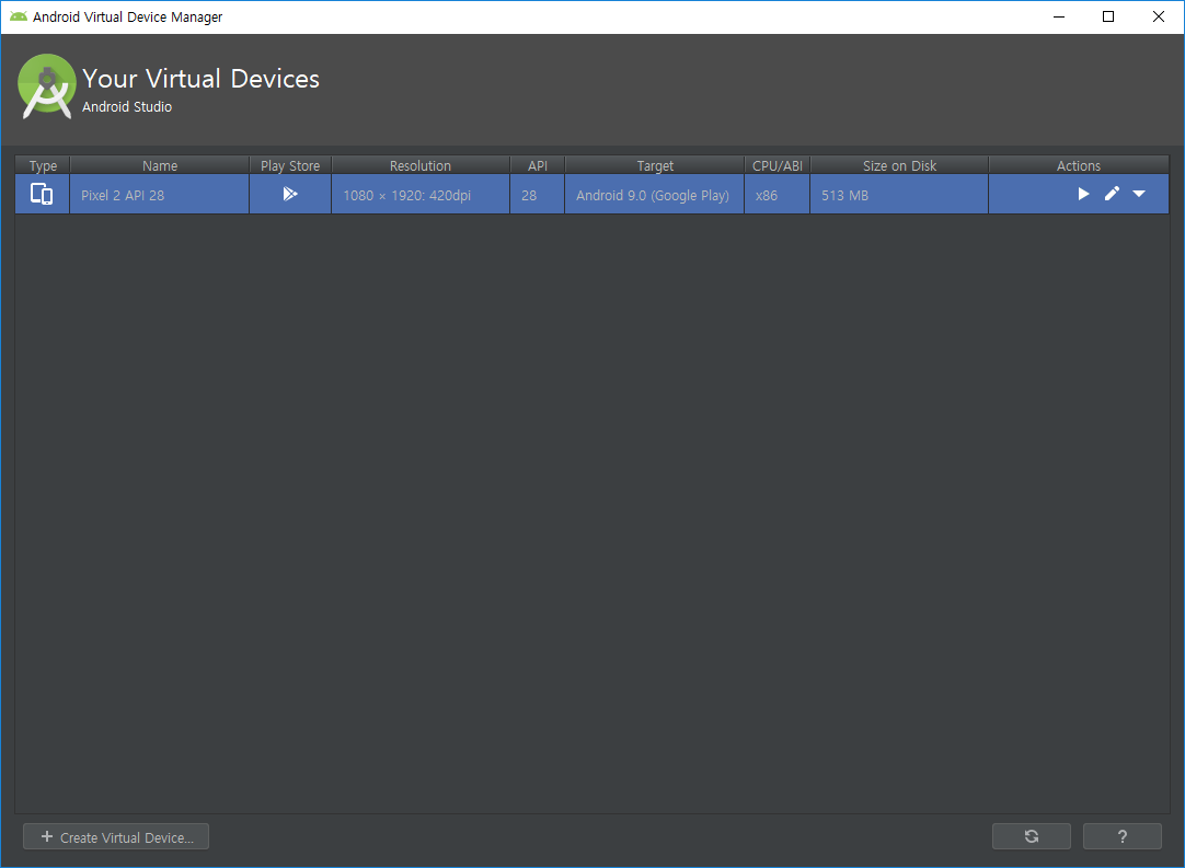 오른쪽 Actions의 재생 모양 버튼을 클릭하여 가상 머신을 켤 수 있지만 앱을 실행하면 켜지기 때문에 잘 쓸 일이 없다.