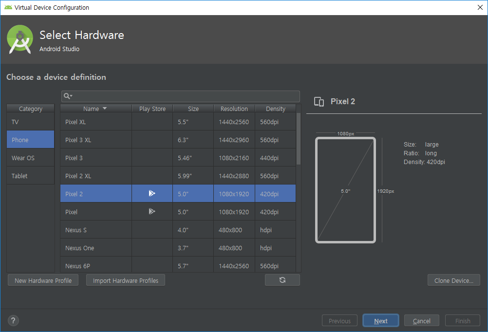 AVD Manager를 실행한 후 Create Virtual Device를 클릭